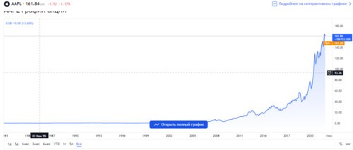 Если рассматривать, к примеру, график котировок акций Apple за все время, то можно сделать вывод, что несмотря на взлеты и просадки, цена неуклонно растет в долгосрочной перспективе. Уровень заработка будет определяться в первую очередь выбором точек входа и выхода. К примеру, если бы акции были приобретены на пике и проданы в период коррекции фондового рынка 2020 г., то инвестор по факту получил бы убыток. При пассивной же стратеги инвестирования с момента основания компании инвестор смог бы увеличить свой капитал к 2021 году на 36 566%! В расчете не учтены дивиденды.
